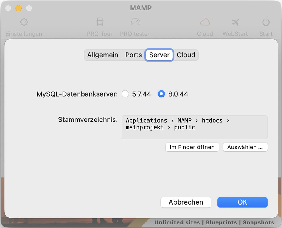 Beim Start von MAMP kannst du zwischen zwei Webservern auswählen; Apache und Nginx. Für die Verwendung mit Contao empfehle ich dir Apache.