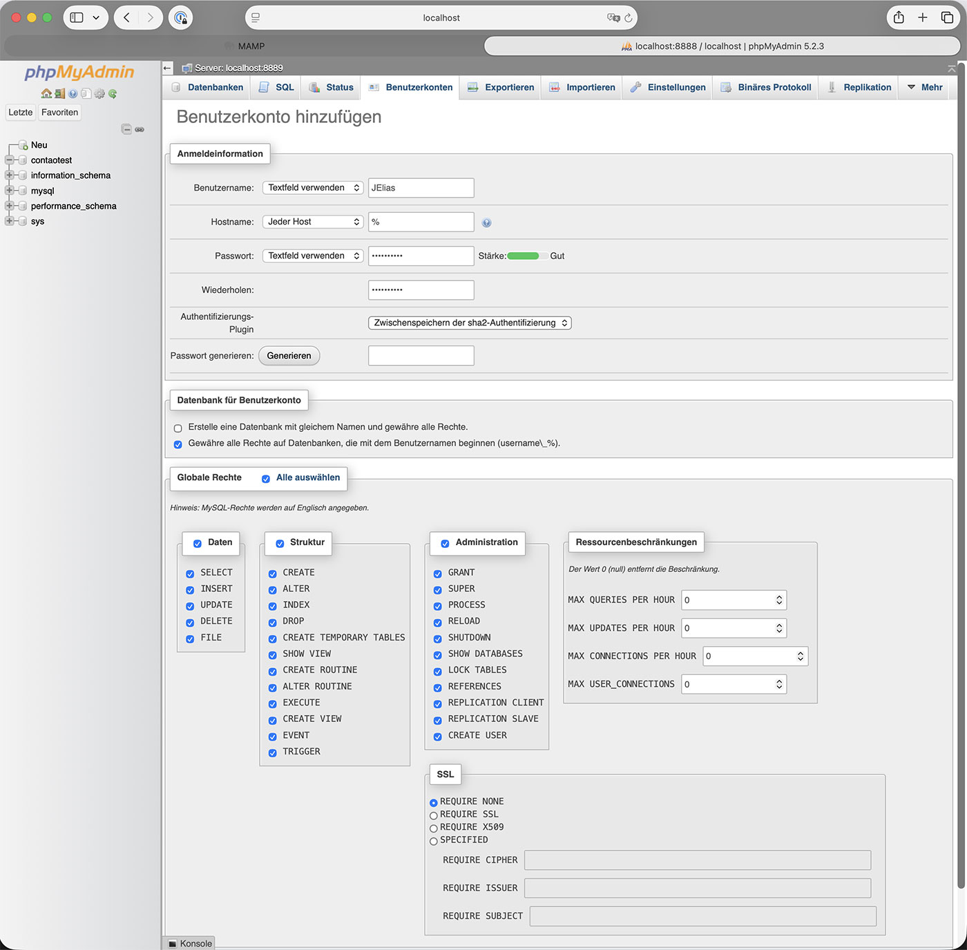 Die Datenbank "contaotest" sollte jetzt in der linken Spalte ausgewählt sein. Wechsle auf den Reiter "Rechte" und lege dort mit "Benutzerkonto hinzufügen" einen neuen Benutzer an. Du musst hier einen Benutzernamen und ein Passwort vergeben. Als Administrator willst du natürlich alle Rechte auf die Datenbank, wähle deshalb die Optionen "Gewähre alle Rechte auf die Datenbank contaotest." und "Globale Rechte: Alle auswählen" an. Klicke links unten auf den Button "OK"! Der neue Benutzer wurde hinzugefügt.