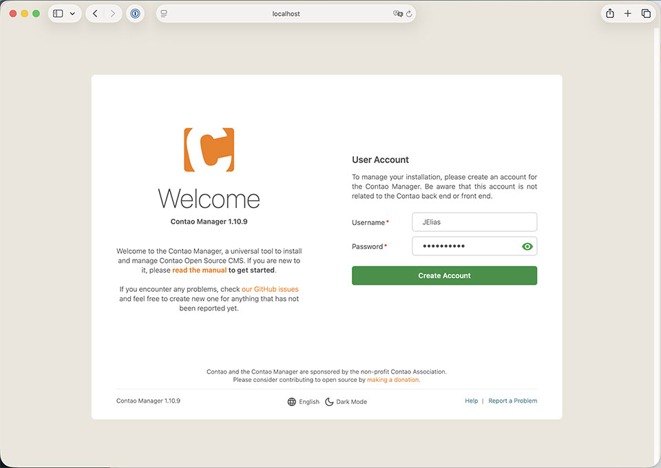 Lege zunächst den User-Account für den Contao-Manager an. Dazu vergibst du einen Username und ein Passwort und klickst auf "Create Account".