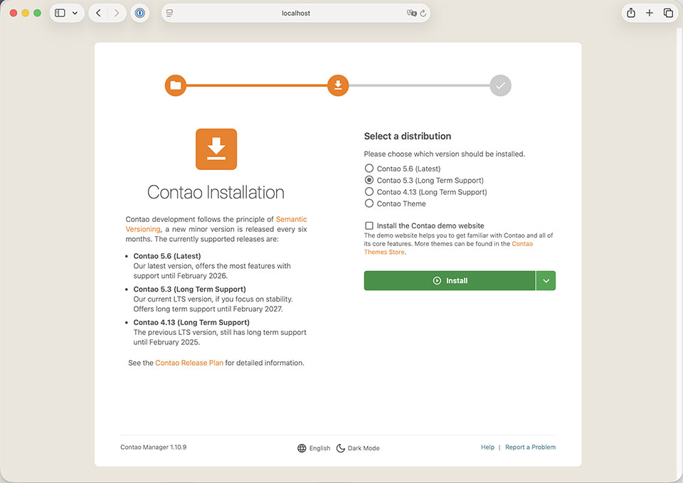 Im nächsten Schritt wählst du deine bevorzugte Version aus; in diesem Beispiel ist es die Version 5.3 (Long Term Support). Du kannst gerne die Demo Website mitinstallieren. Klicke auf "Install"!