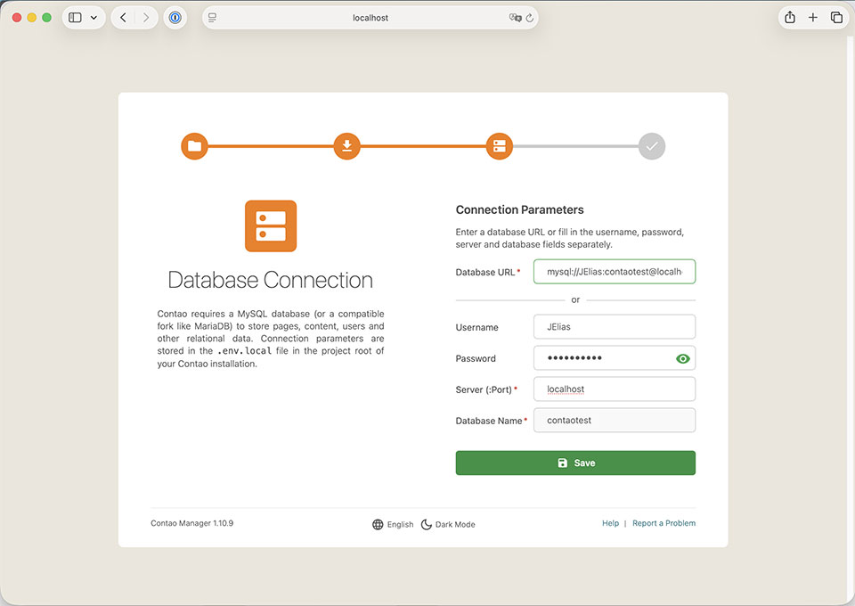 Halte die Daten für deine Datenbank bereit! Du musst sie jetzt korrekt eintragen, damit die Verbindung zwischen Contao und der Datenbank hergestellt werden kann. Klicke auf "Save"!