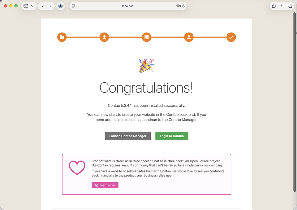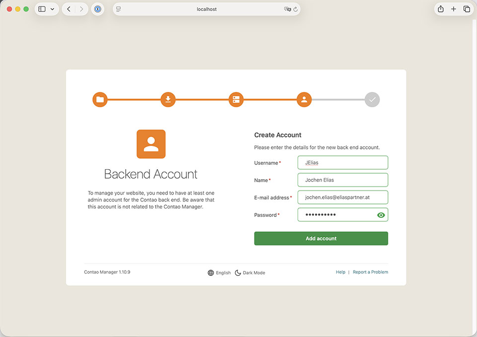 Jetzt kommen wir zu den Zugangsdaten für das Contao Backend. Beim Punkt „Backend Account“ vergibst du deine Zugangsdaten und Admin-Informationen. Hinweis: Die Zugangsdaten für das Contao-Backend sind unabhängig von denen für den Contao-Manager oder das Contao-Installtool. – Mit einem Klick auf "Add account" schließt du die Installation ab. – Voilá! Deine Installation war erfolgreich.