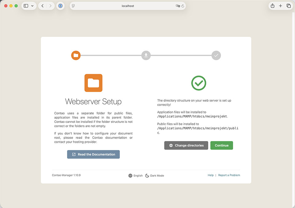 Die Contao-Installation startet. Zunächst wird das "Webserver Setup" durchgeführt. Dabei werden automatisch deine Einstellungen übernommen, mit "Continue" bestätigst du sie.
